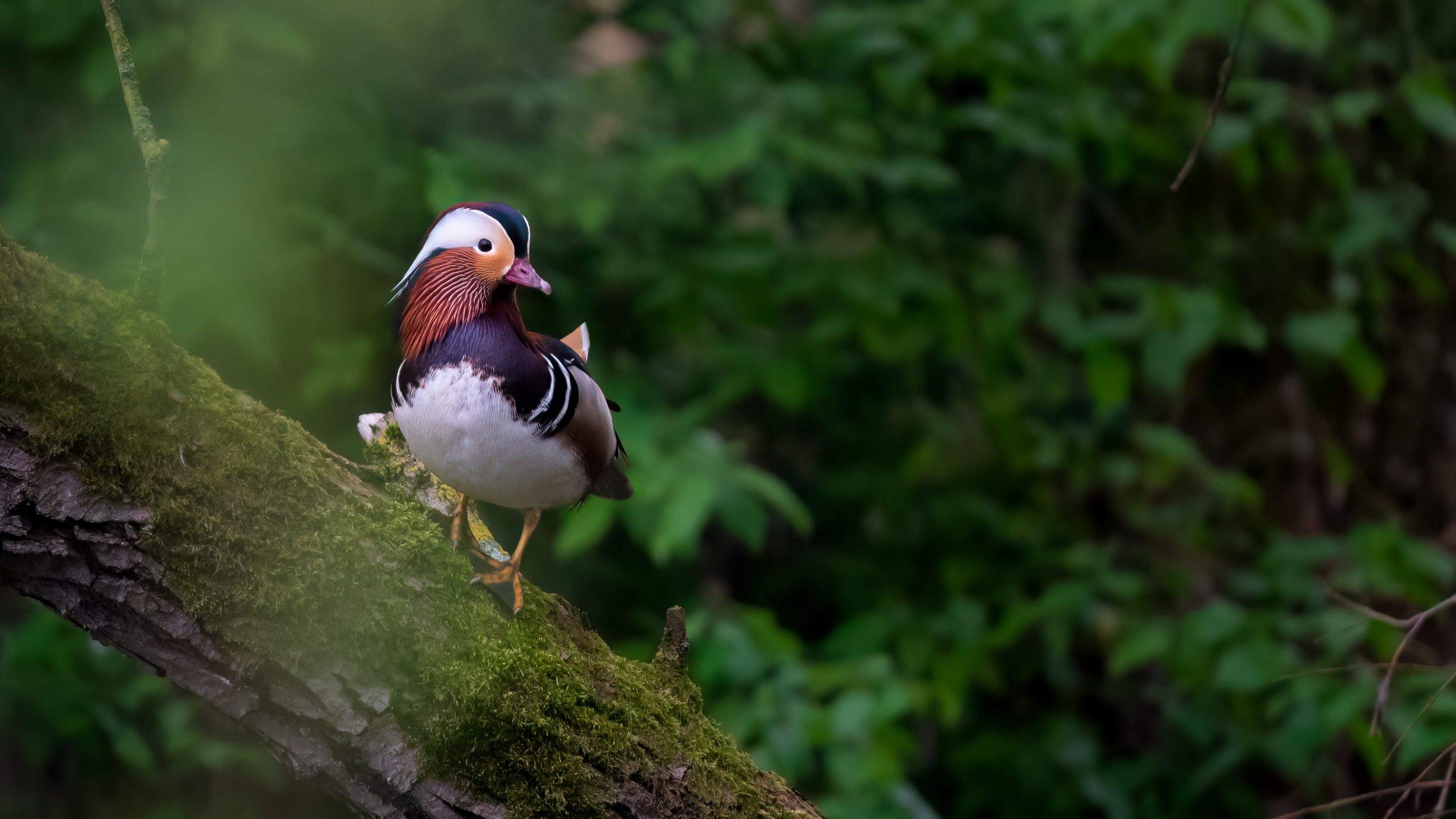 A Mandarin duck perches on a fallen log in a forest.