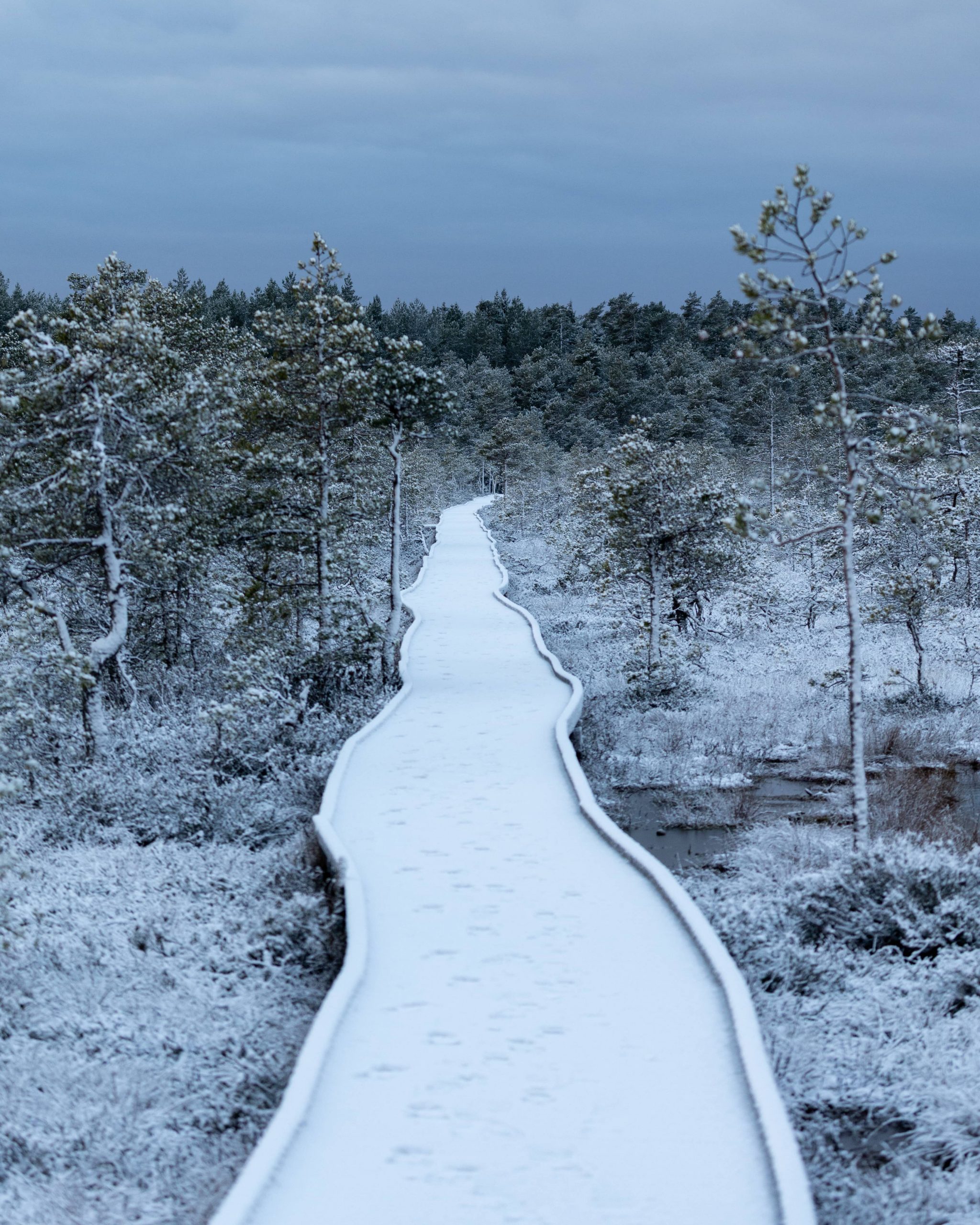 A snowy boardwalk leading into the wintery landscape of Estonia’s Lahemaa National Park.